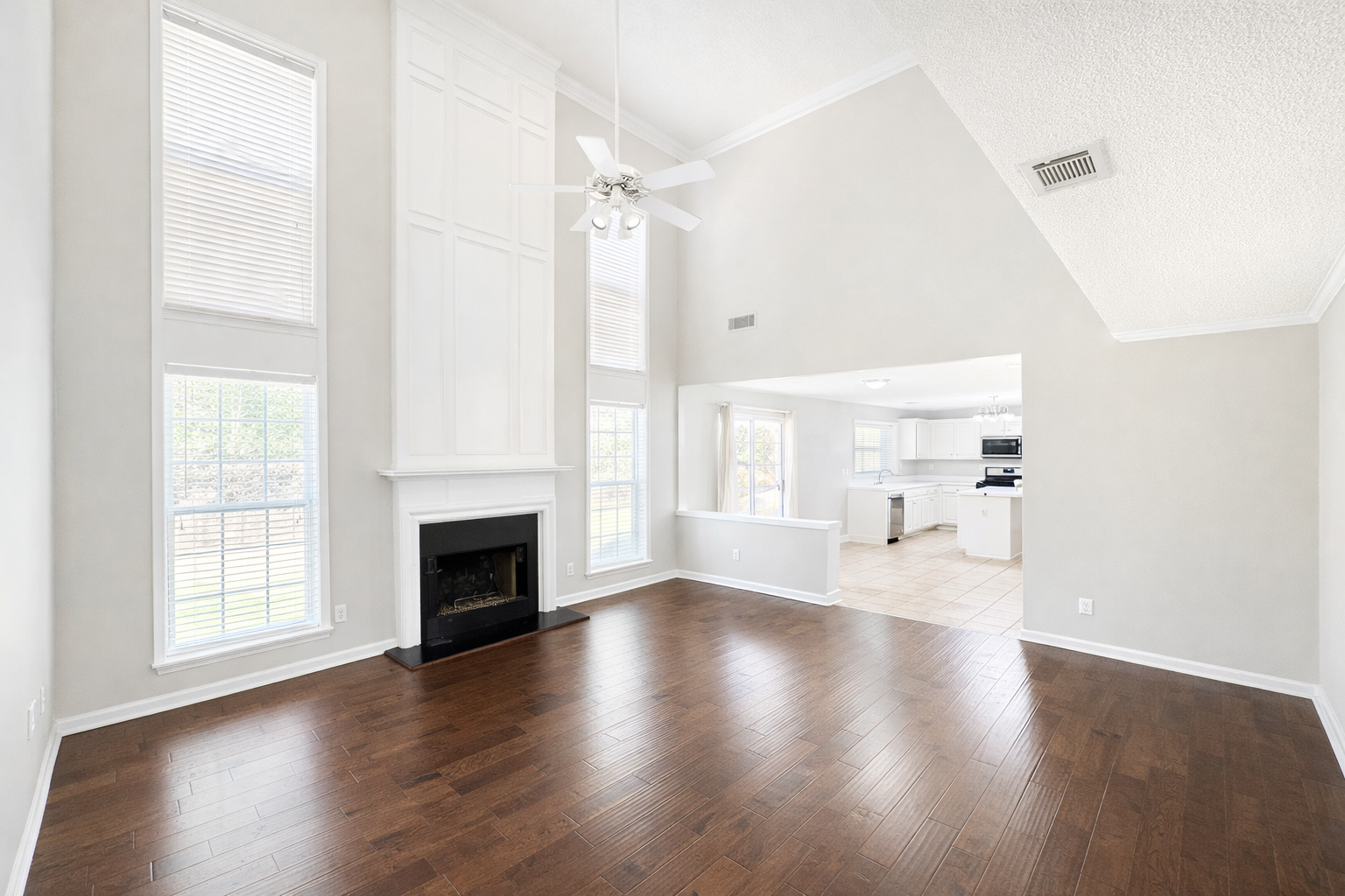 The main level features an open kitchen with white cabinetry, generous counter space, a center island, and breakfast bar seating, all flowing directly into the two story great room with fireplace and abundant natural light. A true separate dining room provides a dedicated space for meals and entertaining. Upstairs, the primary suite offers a private retreat with double vanities, a soaking tub, separate shower, and walk in closet. Two additional bedrooms share a full hall bath, and the upstairs laundry includes washer and dryer for added convenience. A private patio and backyard extend the living space outdoors.