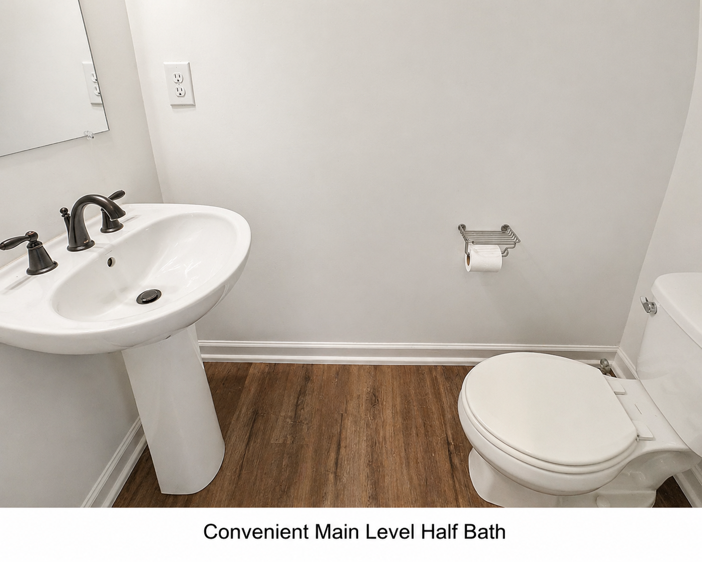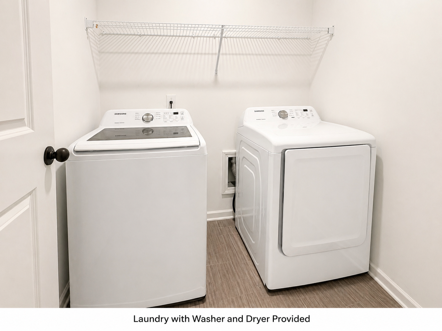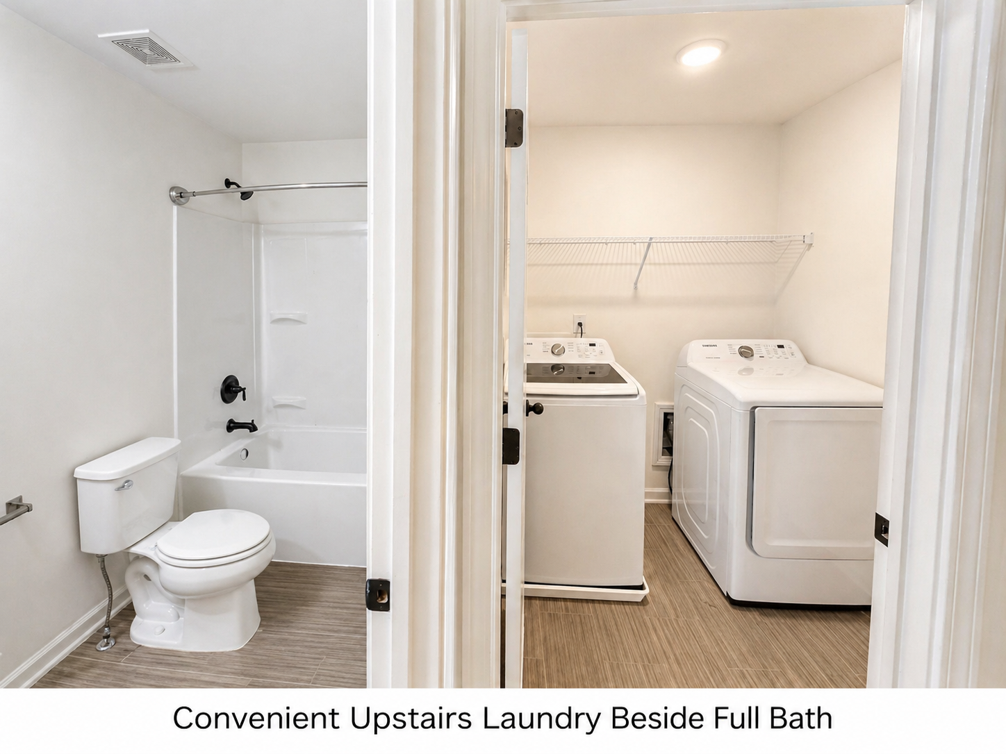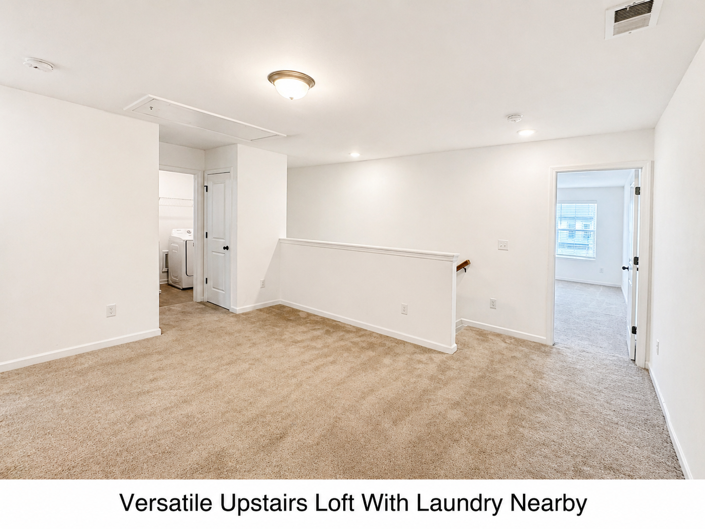 The main level also includes laminate flooring, a convenient half bath, and access to a private rear patio for easy outdoor relaxing. Upstairs, the oversized primary suite features a large walk-in closet and double vanity bath. Two additional bedrooms, a full shared bathroom, a loft/bonus area, and a dedicated laundry room with washer and dryer included complete the second floor.